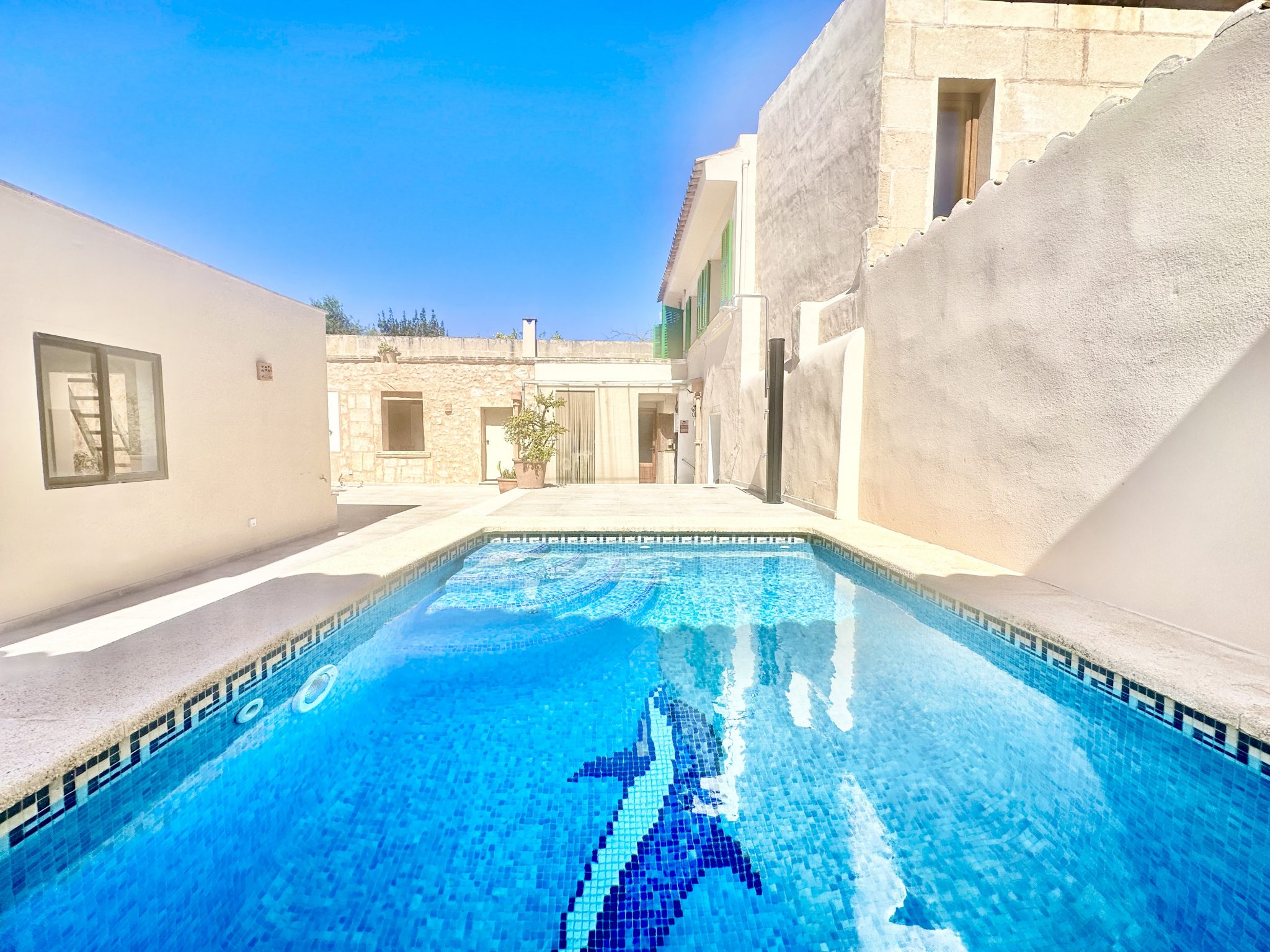 The idyllic patio with its south-west facing pool invites you to sunbathe and relax. Mediterranean plants create a private atmosphere in the middle of the village.