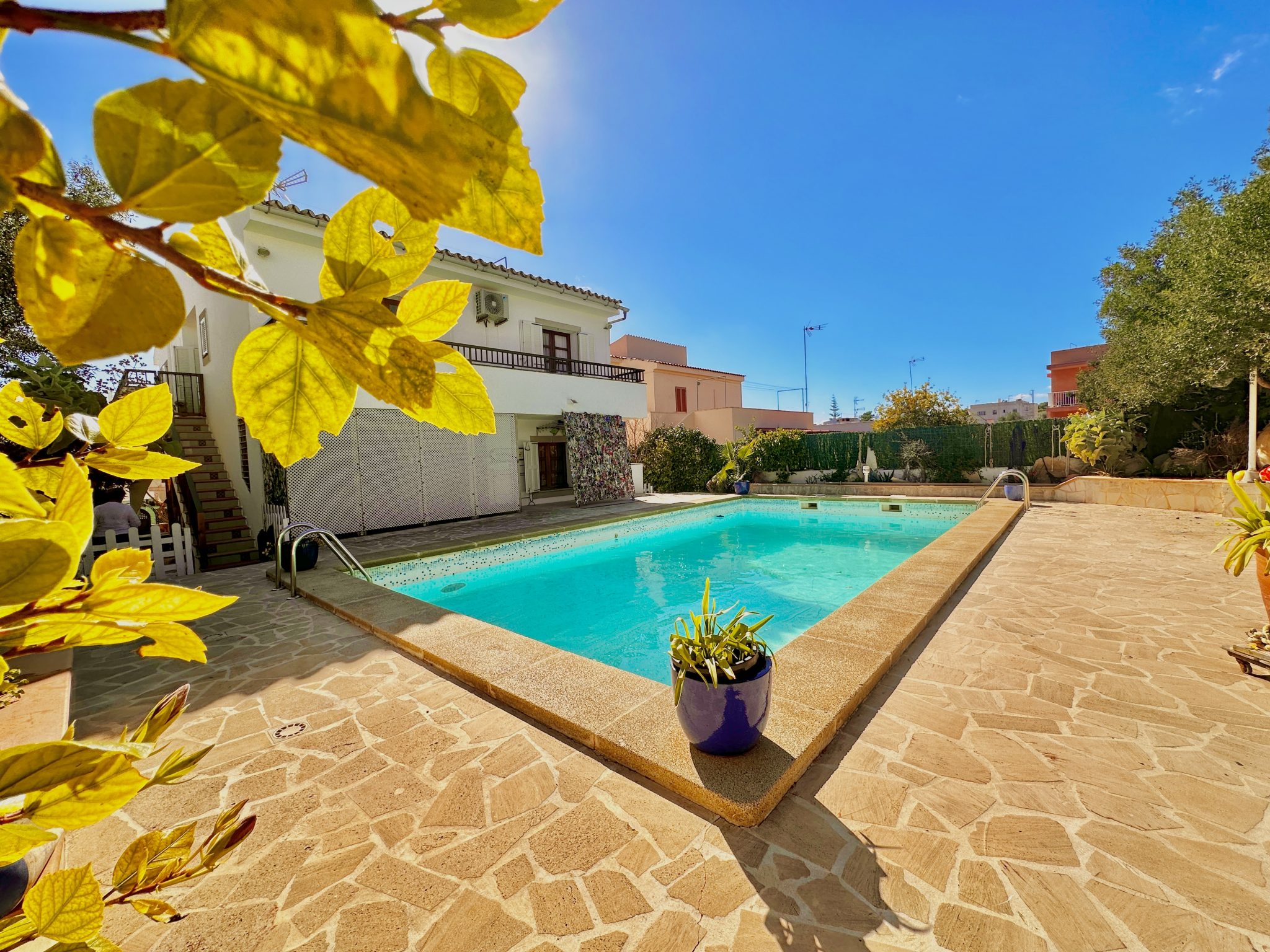 En el centro del auténtico pueblo pesquero de Porto Colom se encuentra este interesante chalet con un bonito terreno y una piscina en una ubicación absolutamente soleada a un paso del mar.