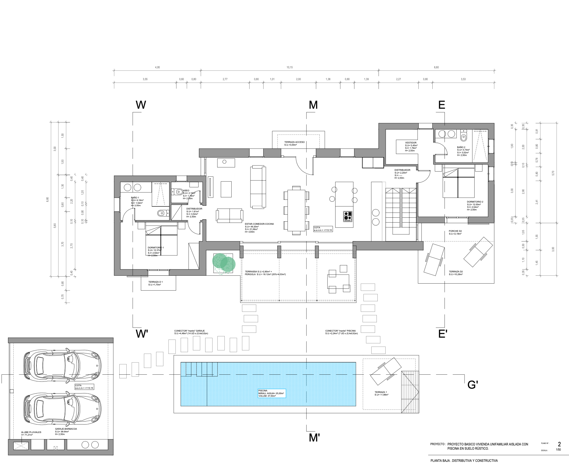 Das Projekt umfasst ein zweistöckiges Haus mit einer gesamten bebauten Fläche von 284 qm und verteilt sich auf ein stilvolles Erd- und Obergeschoß.