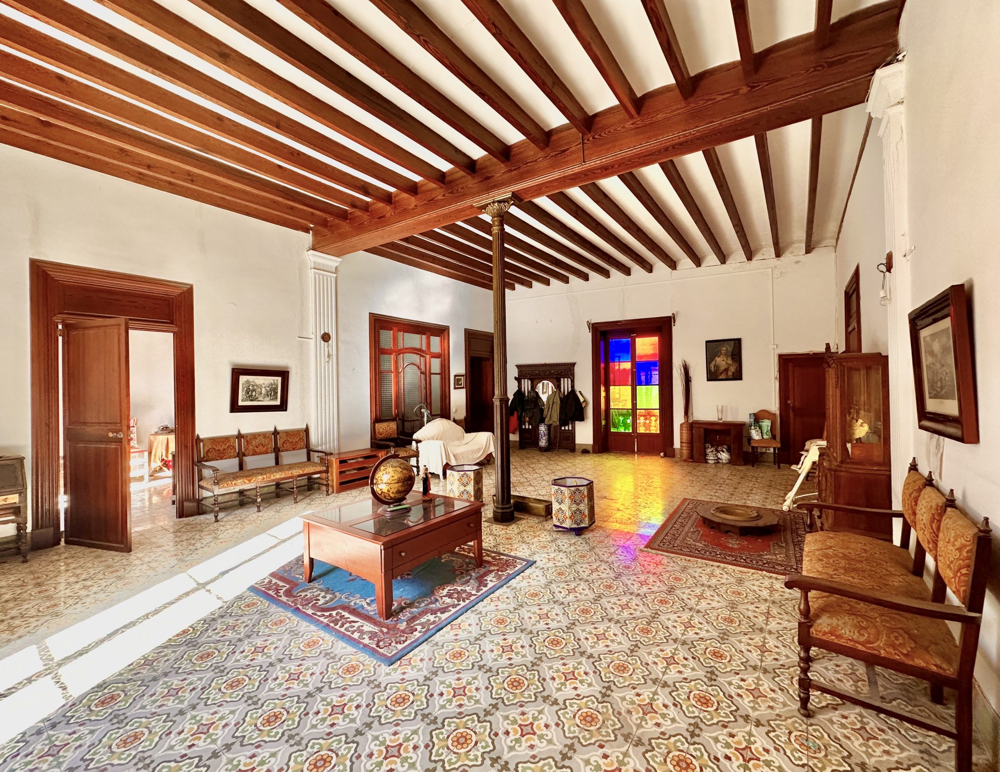 Die erste Etage wurde vollständig renoviert und präsentiert sich in traditionell mallorquinischem Stil. Hohe Decken mit sichtbaren Holzbalken, originelle Türen und Fenster sowie sorgfältig erhaltene Details verleihen der Wohnung einen authentischen Charme und ein angenehmes Wohnambiente.