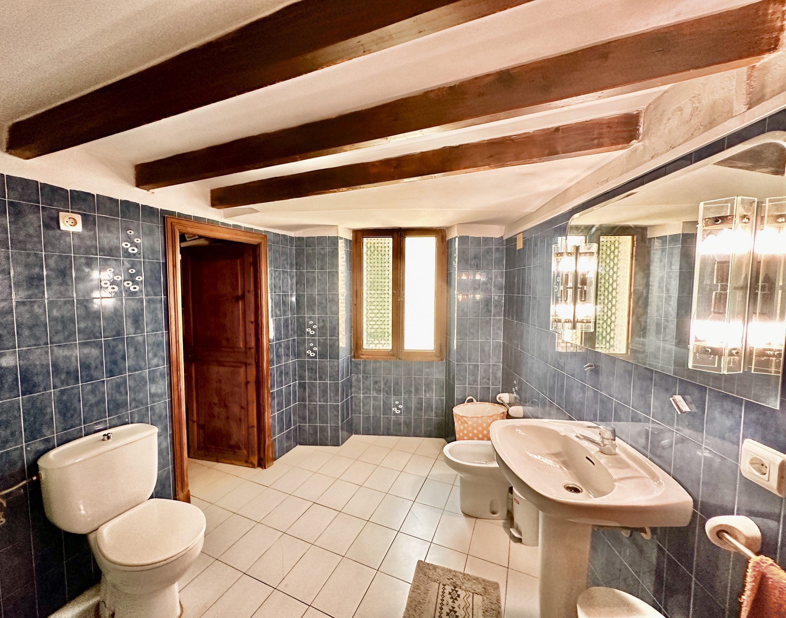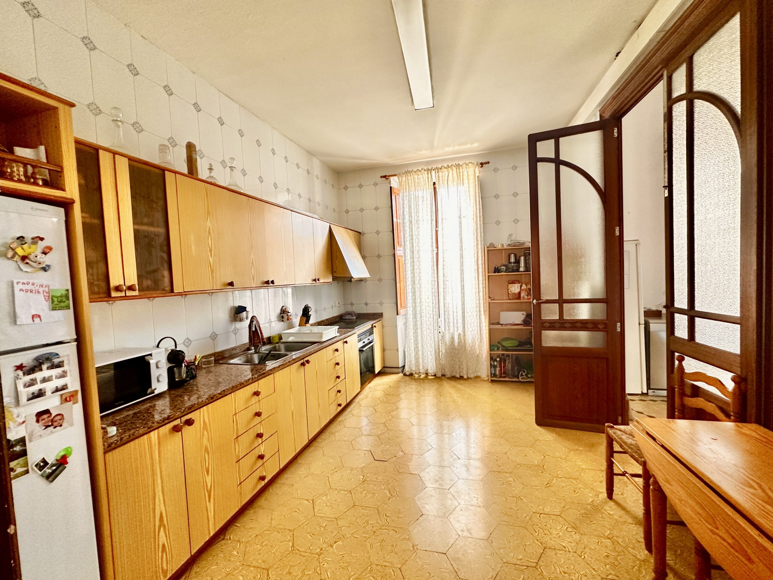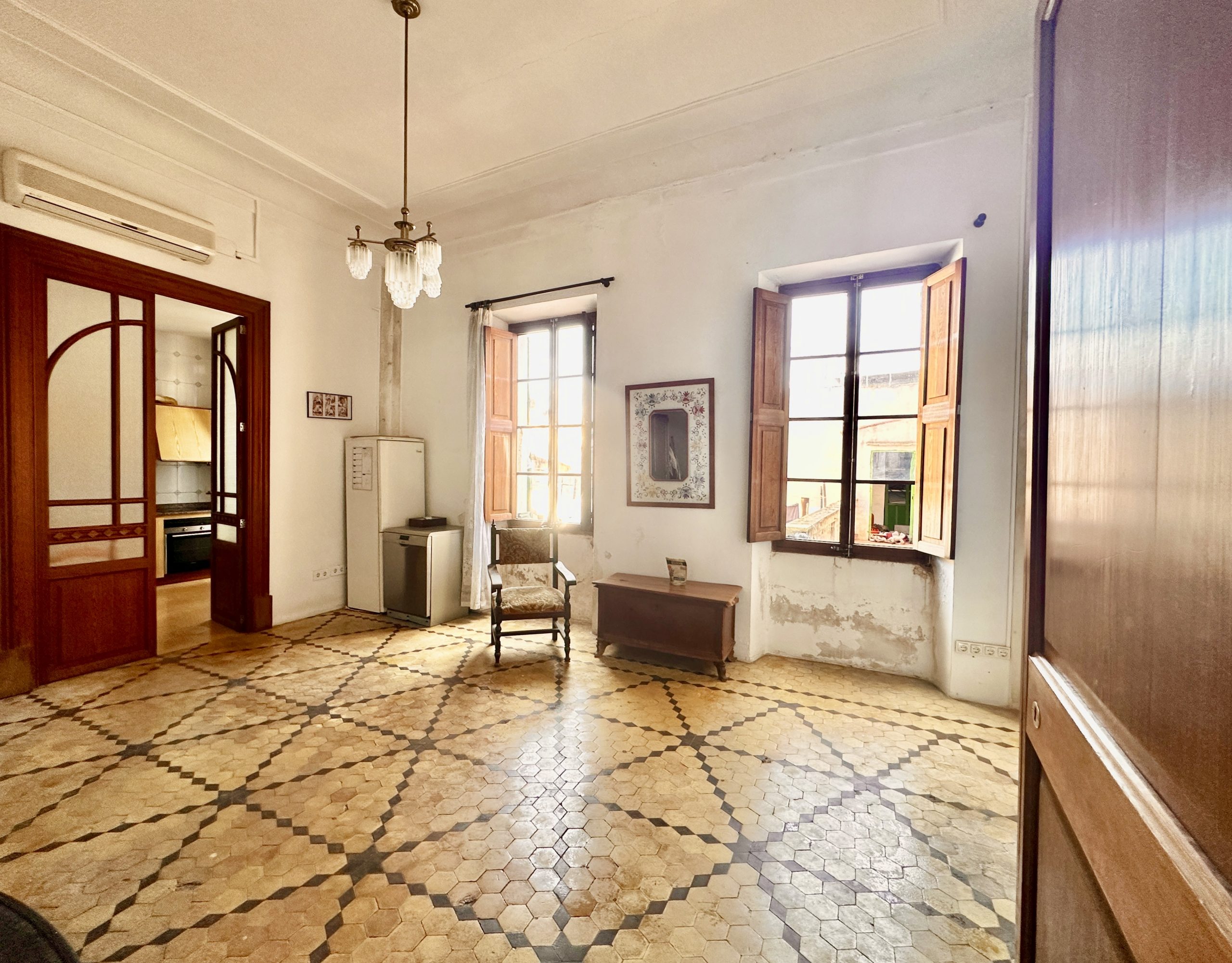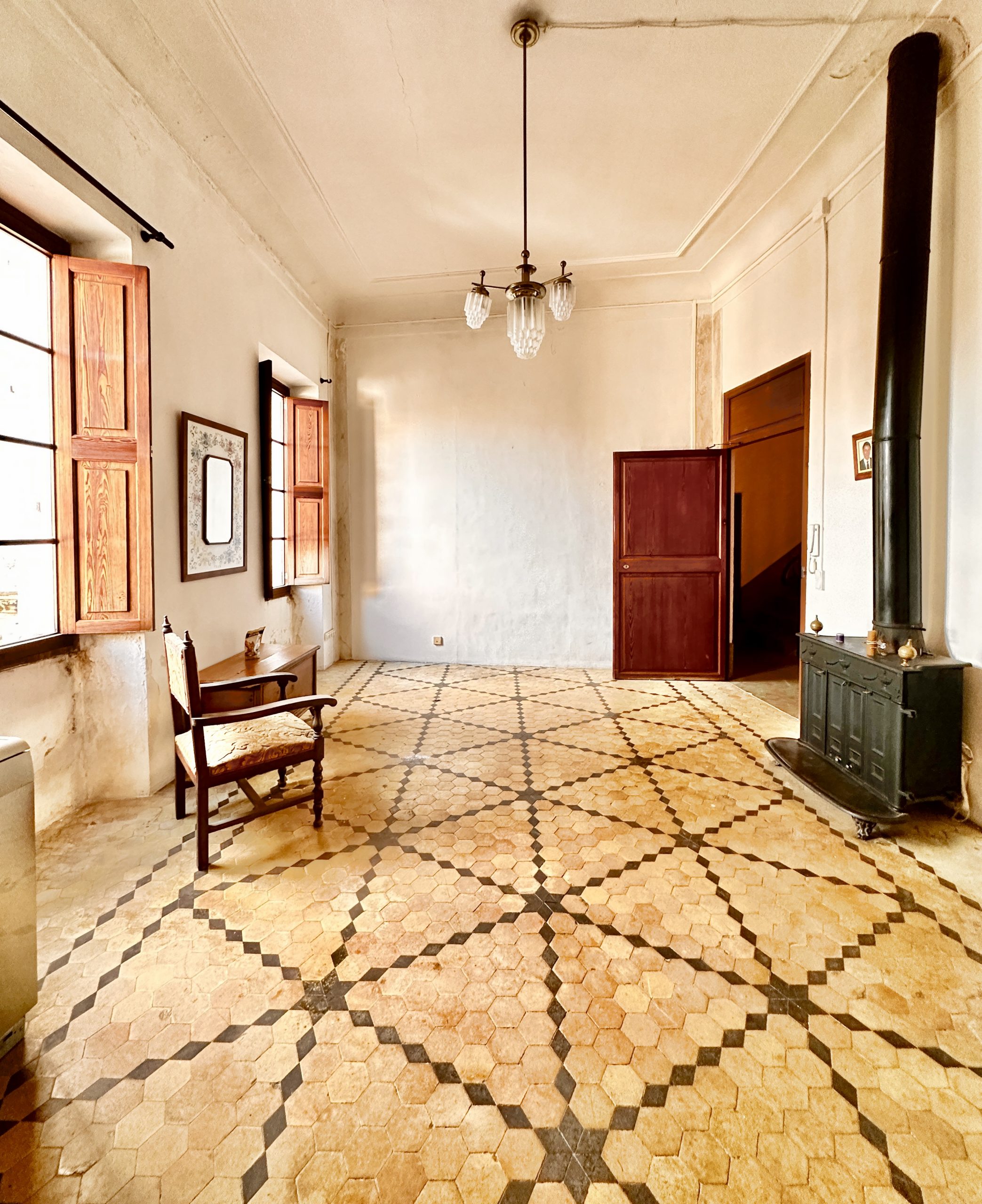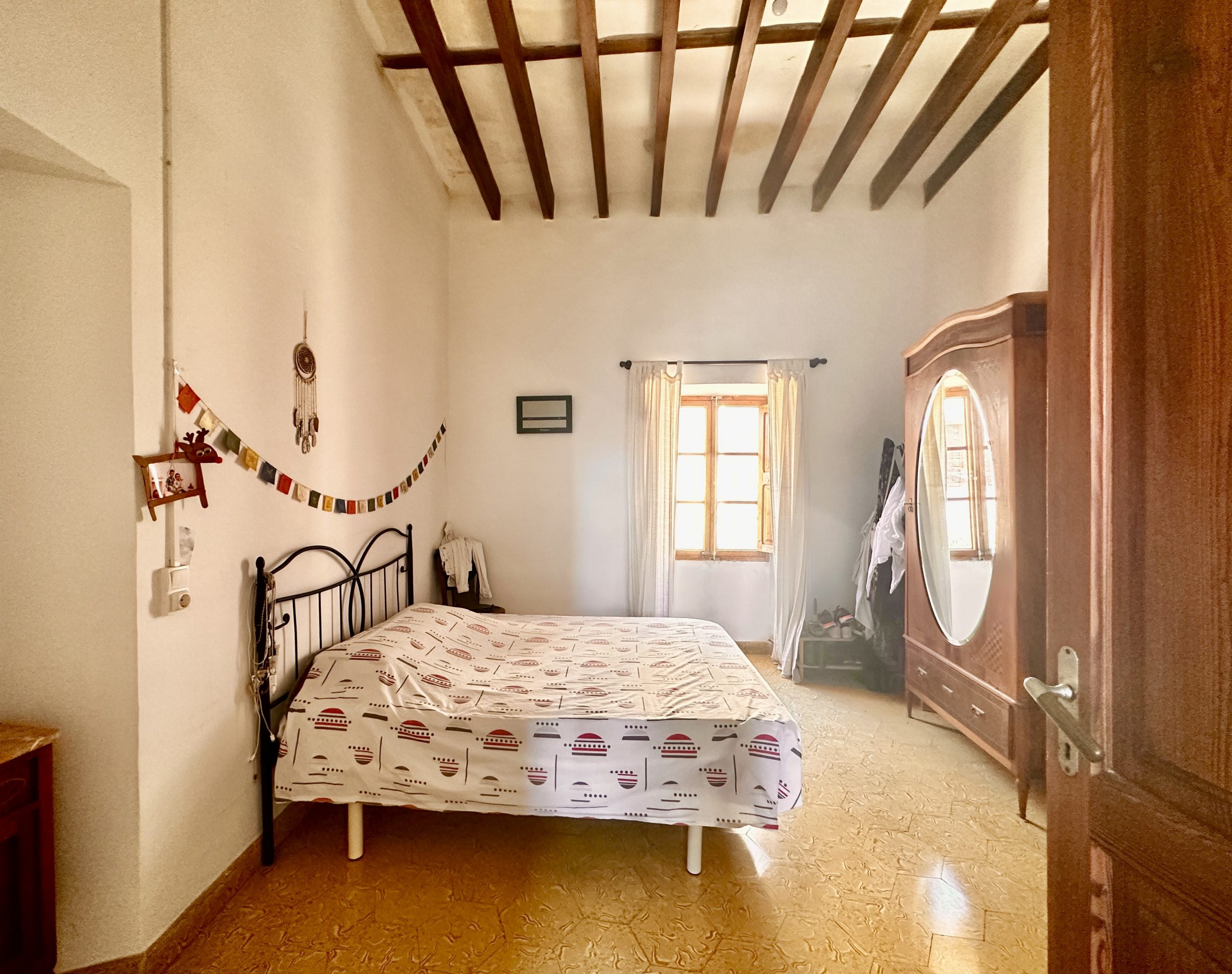 Die erste Etage wurde vollständig renoviert und präsentiert sich in traditionell mallorquinischem Stil. Hohe Decken mit sichtbaren Holzbalken, originelle Türen und Fenster sowie sorgfältig erhaltene Details verleihen der Wohnung einen authentischen Charme und ein angenehmes Wohnambiente.