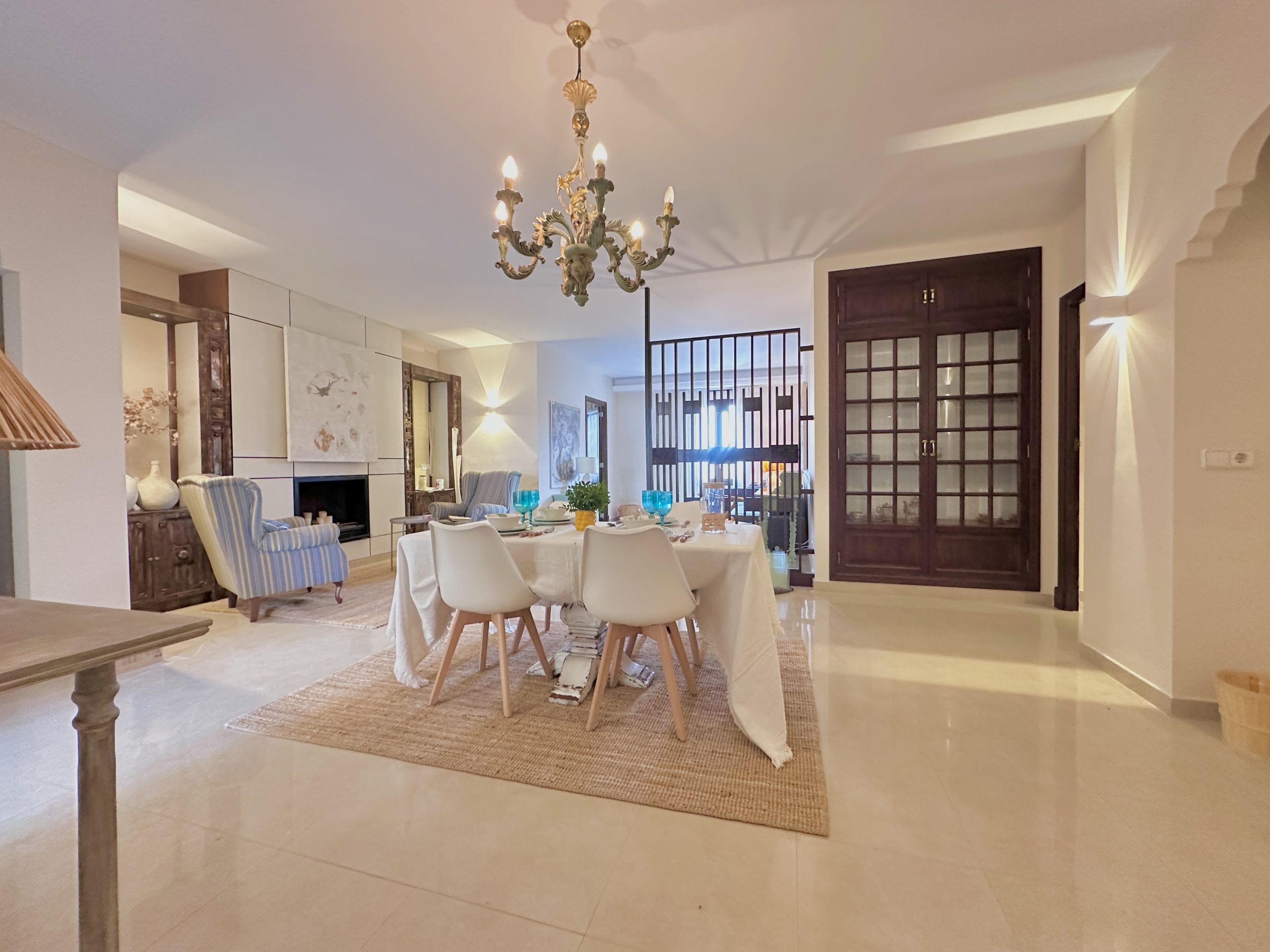 Herzstück der Wohnung ist der großzügige Wohn-und Essbereich, der mit seinem Kamin eine warme, einladende Atmosphäre schafft und sowohl für entspannte Abende als auch für repräsentative Anlässe ideal geeignet ist. Die offene Gestaltung sorgt für ein modernes Wohngefühl und ein harmonisches Zusammenspiel von Kochen, Essen und Wohnen.