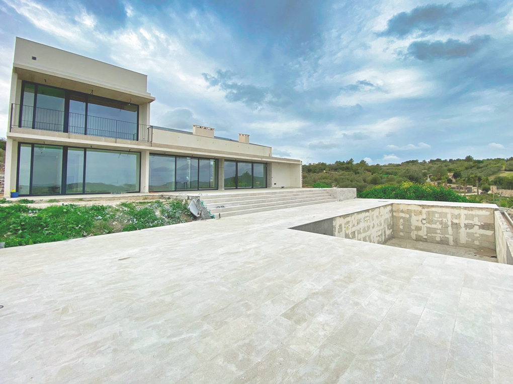 Mitten in herrlicher Naturlandschaft mit fantastischem Blick befindet sich diese außergewöhnlich attraktive und modäne Neubau – Finca mit Salzwasserpool in bevorzugter Umgebung von Porreres / Montuiri.