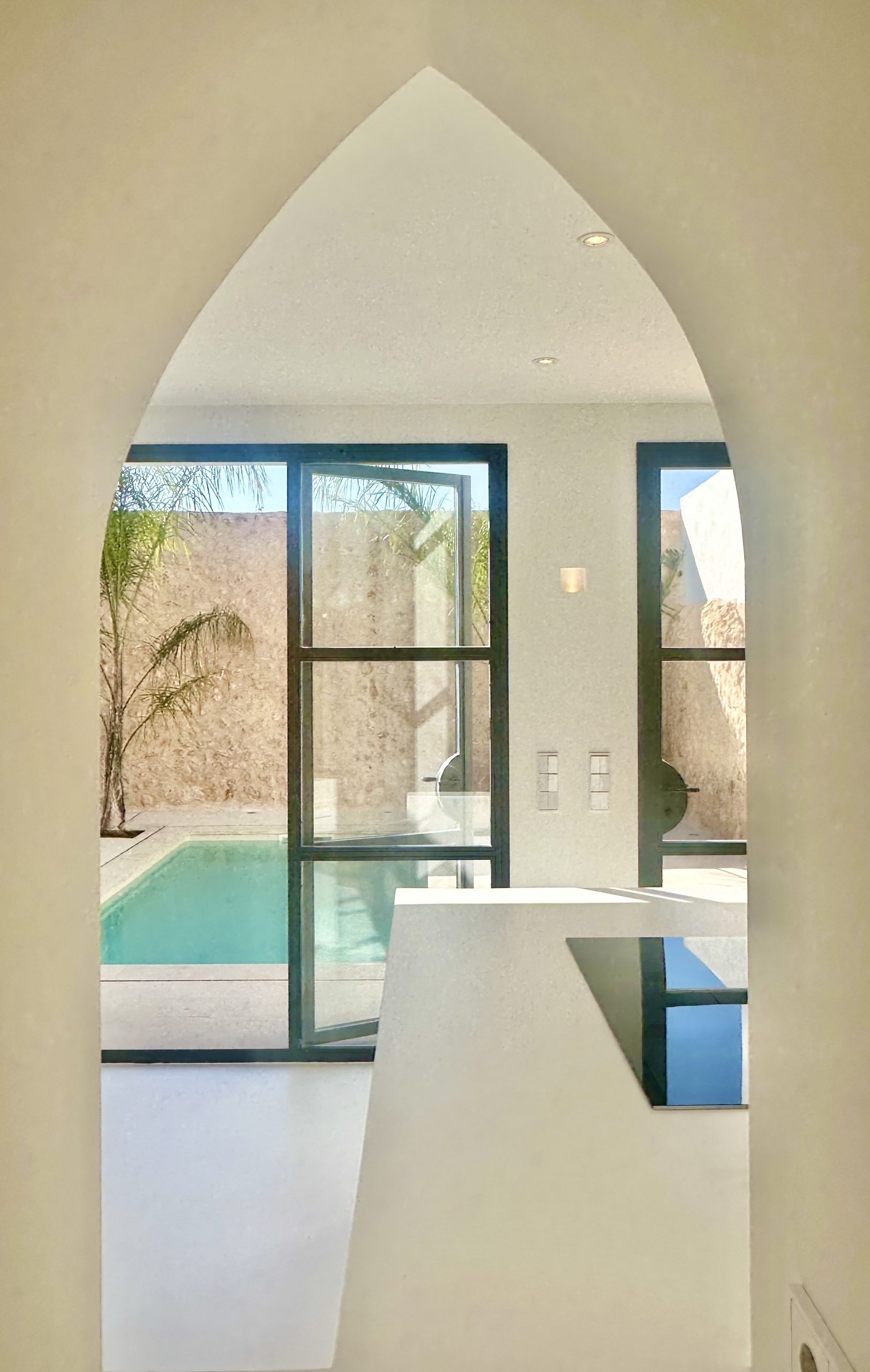 Sichtachsen in den Wohnbereich bis hin zum Patio mit dem türkisfarbenen Pool machen Lust auf mehr.