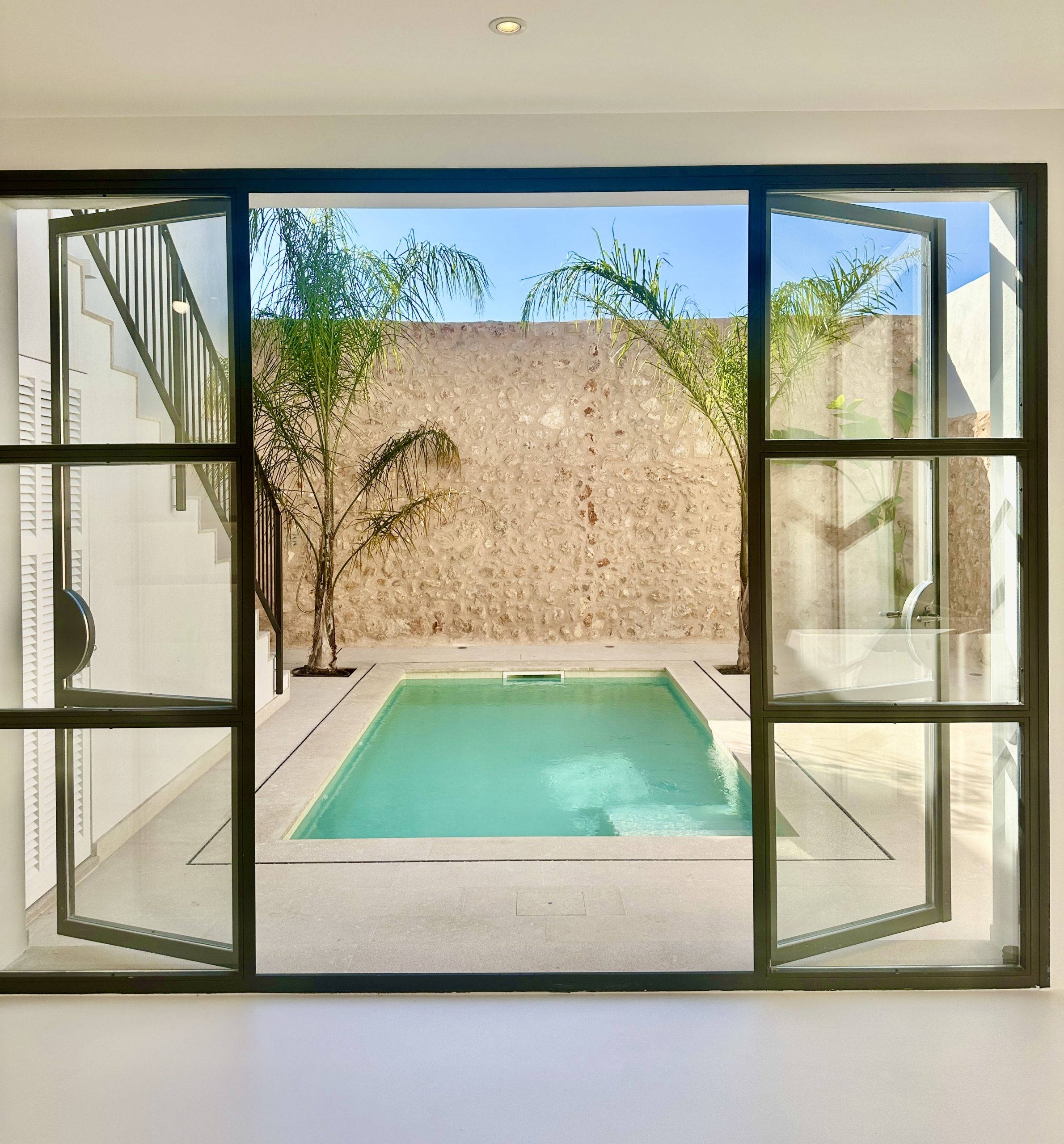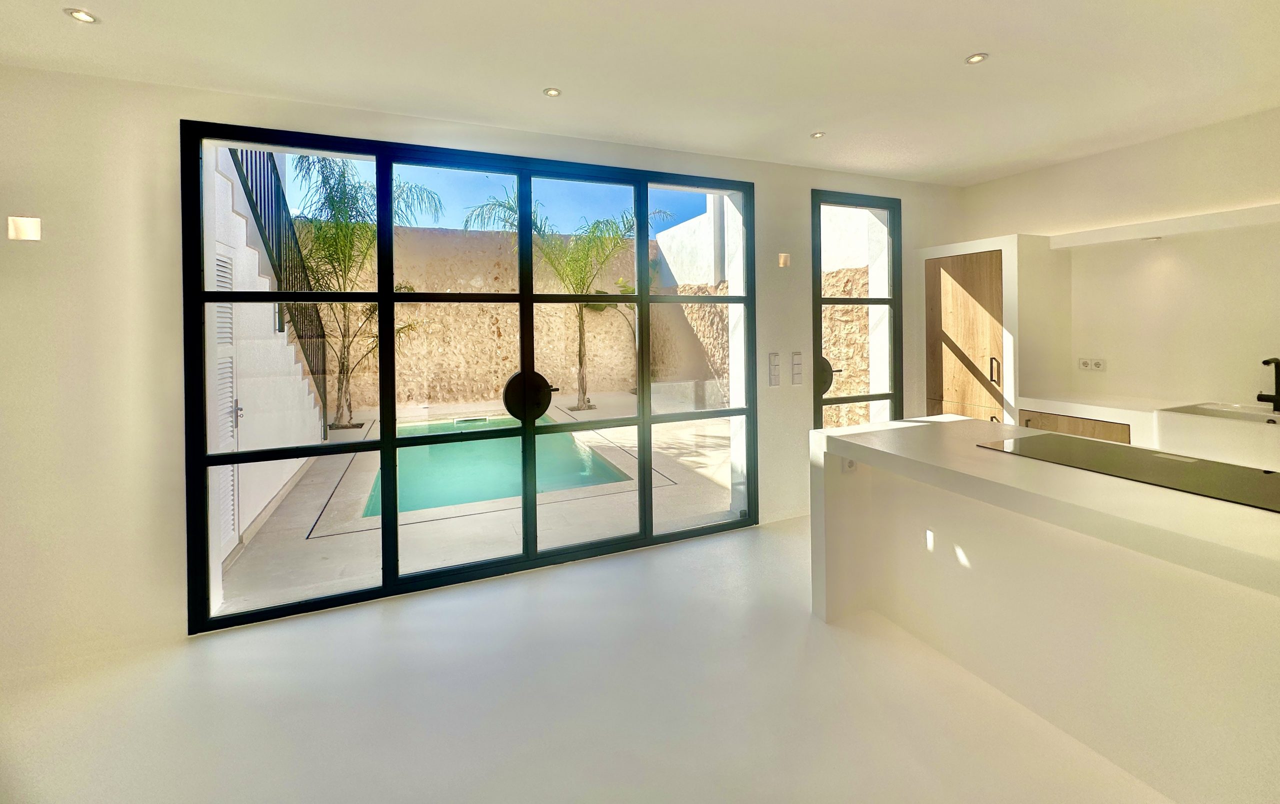 Die Deckenhöhe ein Traum für jeden Altbauliebhaber. Die Terrasse mit Natursteinen mit Blick auf den beleuchteten Pool, der Ort für gemeinsame Abende, geborgen in einem Patio umgeben von dicken, rustikalen Mauern.